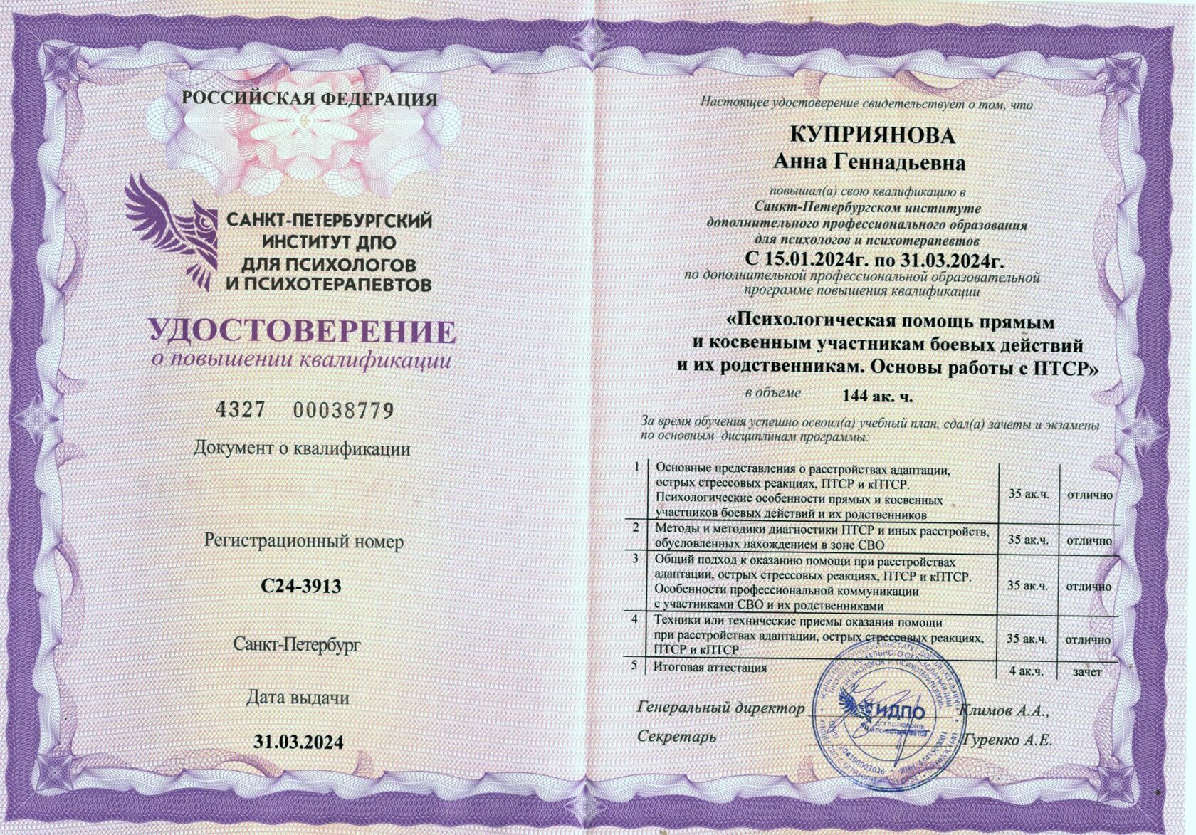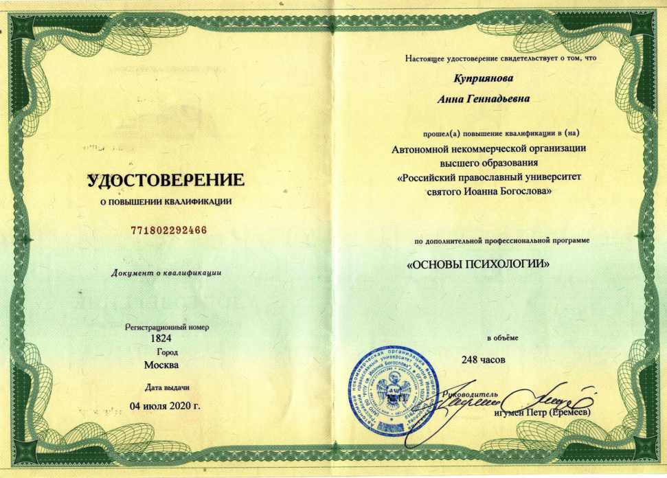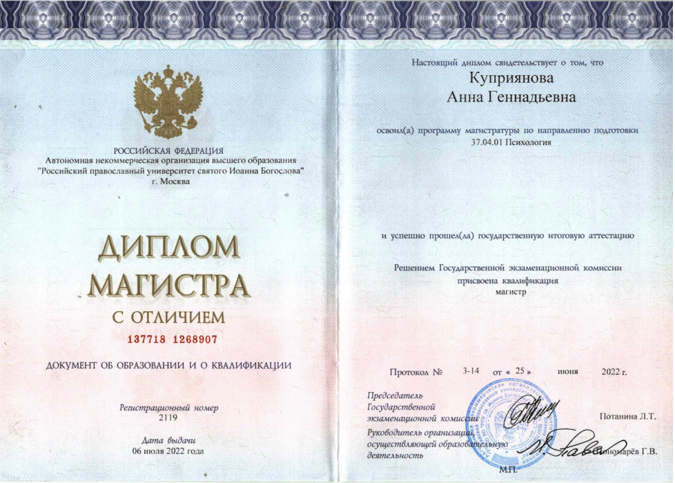 Дипломированный психолог Куприянова Анна Геннадиевна