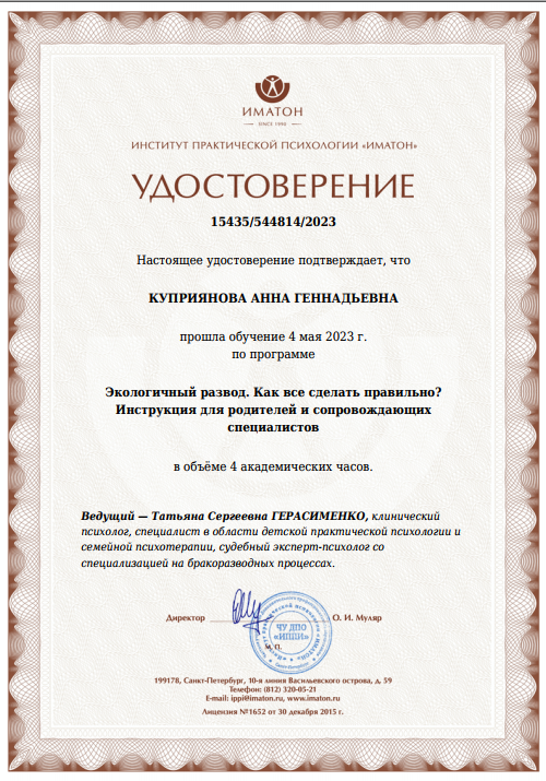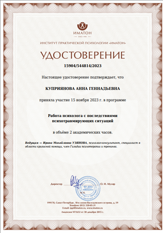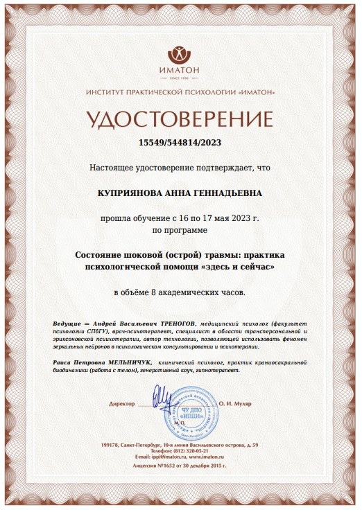 Повышение квалификации на базе научно-практического института психологии «Иматон» (Шоковая травма; Работа психолога с последствиями психотравмирующих ситуаций; Основы работы с ПТСР; Экологичный развод)